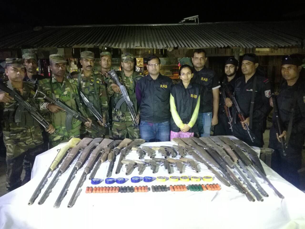 বান্দরবানের লামা উপজেলায় ফাঁসিয়াখালী ইউনিয়নের ১নং ওয়ার্ডের দূর্গম রাজা পাড়া এলাকা হতে বৃহস্পতিবার রাত ৮টার দিকে র্যাব ও সেনাবাহিনী যৌথ অভিযান চালিয়ে ২৫টি আগ্নেয়াস্ত্র (১৪টি এসবিবিএল ও ১১টি ওয়ানশুটারগান) ও ২০৩৭ রাউন্ডগুলিসহ ৪ জন উপজাতি সন্ত্রাসীকে আটক করেছে। আটককৃতরা হল ছাইলুং মার্মা (৩৫), সুইচামং মার্মা (৩৪), মেফা মার্মা (৪১) ও ঐক্য মার্মা (৪০)। তারা সবাই ফাসিয়াখালী ইউনিয়নের ত্রিশডেবা এলাকার বাসিন্দা।