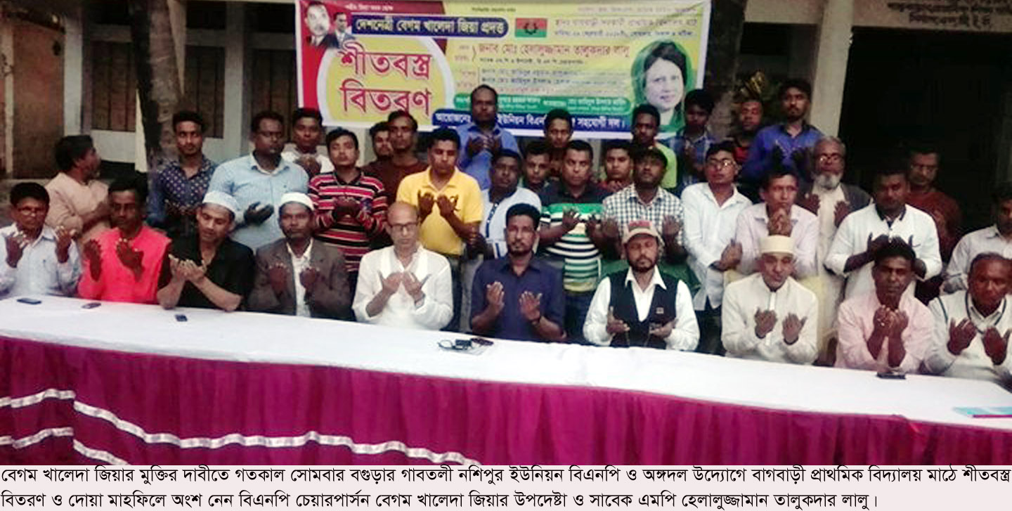 কারাবন্দী বিএনপির চেয়ারপার্সন দেশনেত্রী বেগম খালেদা জিয়ার মুক্তির দাবিতে সোমবার বগুড়ার গাবতলী নশিপুর ইউনিয়ন বিএনপি ও অঙ্গদলের উদ্যোগে বাগবাড়ী সরকারি প্রাথমিক বিদ্যালয় স্কুল মাঠে দোয়া মাহফিল ও দুস্থদের মাঝে শীতবস্ত্র বিতরণ করা হয়।