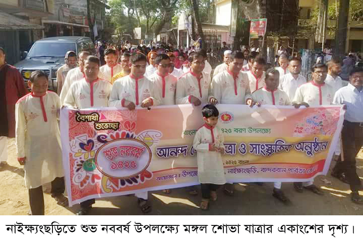পার্বত্য নাইক্ষ্যংছড়িতে মার্মা নৃ-গোষ্টির মঙ্গলশোভা যাত্রা যেন পাহাড় জুড়ে রংধনুর ঝিলিক ছড়িয়ে পড়েছিল। শনিবার বাংলা নববর্ষ তথা পহেলা বৈশাখের প্রথম প্রহরের বর্ণিল আয়োজনে সকাল সাড়ে ৭ টায় নতুন সাজে সেজেছিল মার্মা তরুন-তরুনীরা। আর তাদের আগে-পিছে ছিল অগণিত বৃদ্ধ আর বৃদ্ধা।