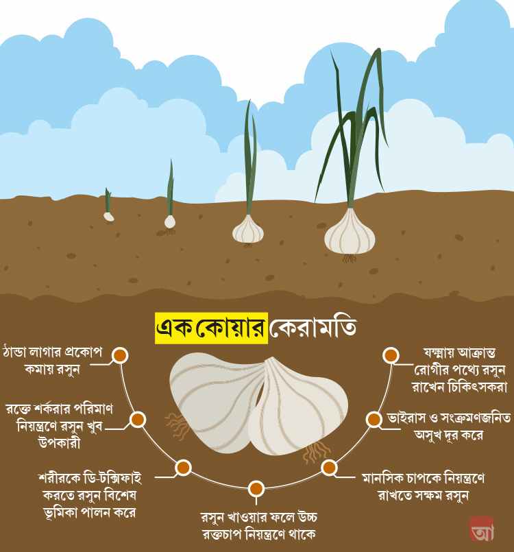 পুষ্টিবিদ অন্তরা মজুমদারের মতে, এখন থেকেই সকালে বরং খালি পেটে এক কোয়া রসুন খাওয়ার অভ্যস করুন। কিন্তু সব থাকতে রসুনই বা কেন? এমন কী গুণাগুণ রয়েছে রসুনের, জানেন?