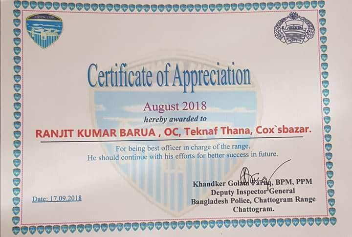 উল্লেখ্য, ওসি রনজিত বড়ুয়া কক্সবাজার জেলায় ৫ বার ও চট্টগ্রাম রেঞ্জে ২ বার শ্রেষ্ঠ ওসির সম্মাননা পান।