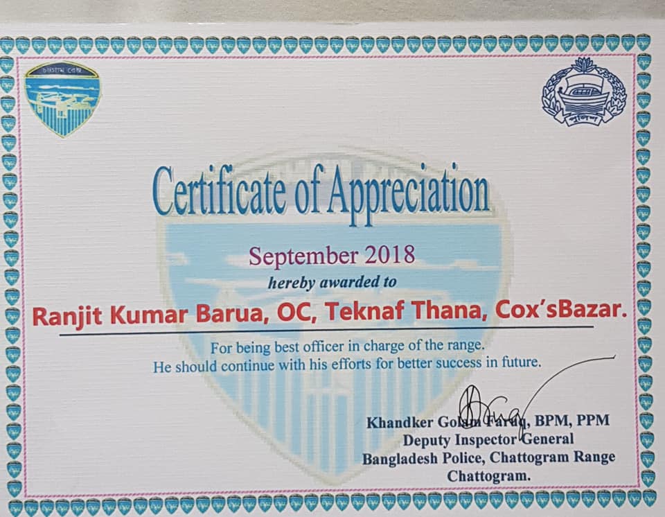 উল্লেখ্য, ইতিপূর্বে কক্সবাজার জেলায় ৫ বার ও চট্টগ্রাম রেঞ্জ -এ এবার সহ ৩ বার শ্রেষ্ঠ ওসির সম্মাননা প্রদান করা হয় রনজিত কুমার বড়ুয়াকে।