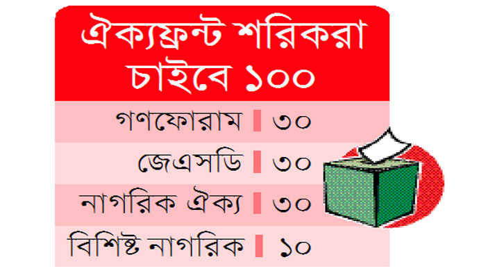 ঐক্যফ্রন্টের তিন দলের কয়েকজন কেন্দ্রীয় নেতা জানান, প্রাথমিকভাবে তারা ৩০টি করে আসন চাওয়ার চিন্তাভাবনা করলেও সার্বিক পরিস্থিতি বিবেচনা করে এ সংখ্যা কমবেশি হতে পারে।