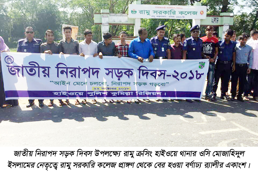 কক্সবাজার রামু ক্রসিং হাইওয়ে থানার উদ্যোগে “আইন মেনে চলব, নিরাপদ সড়ক গড়বো” এই স্লোগানকে সামনে রেখে জাতীয় নিরাপদ সড়ক দিবস উপলক্ষ্যে পৃথক র্যালী ও আলোচনা সভা অনুষ্ঠিত হয়েছে।