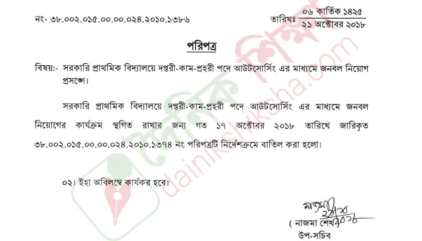 প্রাথমিক ও গণশিক্ষা মন্ত্রণালয়ের উপসচিব নাজমা শেখ স্বাক্ষরিত পরিপত্রে বলা হয়, গত ১৭ অক্টোবর জারি করা সরকারি প্রাথমিক বিদ্যালয়ে দপ্তরী কাম প্রহরী পদে আউটসোর্সিংয়ের মাধ্যমে জনবল নিয়োগ কার্যক্রম স্থগিত রাখার পরিপত্রটি বাতিল করা হল। ইহা অবিলম্বে কার্যকর হবে।