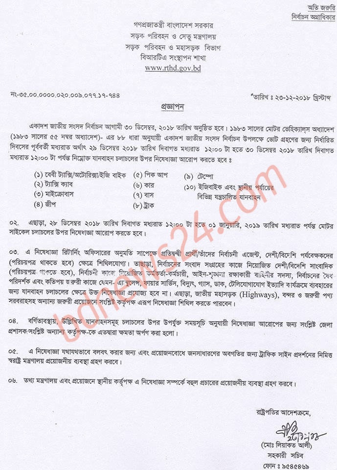 রোববার সড়ক পরিবহন ও মহাসড়ক বিভাগের এক প্রজ্ঞাপনে ভোটগ্রহণের সময়ে গাড়ি চলাচলে নিষেধাজ্ঞা আরোপ করা হয়।