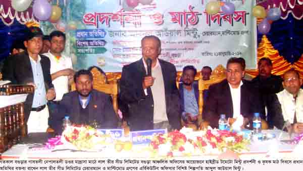 বগুড়ার গাবতলী নেপালতলী ডওর মাদ্রাসা মাঠে লাল তীর সীড লিমিটেড বগুড়া আঞ্চলিক অফিসের আয়োজনে গত সোমবার সন্ধ্যায় হাইব্রীড টমেটো মিন্টু প্রদর্শনী ও কৃষক মাঠ দিবস পালিত হয়েছে। এ উপলক্ষে হাইব্রীড টমেটো মিন্টু ক্ষেত পরিদর্শন শেষে কৃষকদের মাঝে প্রধান অতিথির বক্তব্য রাখেন লাল তীর সীড লিমিটেড চেয়ারম্যান ও মাল্টিমোড গ্রুপের এক্সিকিউটিব অফিসার বিশিষ্ট শিল্পপতি আব্দুল আউয়াল মিন্টু।