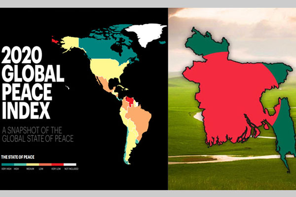 বৈশ্বিক শান্তি সূচকে গত বছরের তুলনায় সাত ধাপ এগিয়েছে বাংলাদেশ। বৃহস্পতিবার অস্ট্রেলীয় গবেষণা প্রতিষ্ঠান ইন্সটিটিউট ফর ইকোনমিক্স অ্যান্ড পিস (আইইপি) প্রকাশিত ২০২১ সালের বৈশ্বিক শান্তি সূচকে বাংলাদেশের এই অগ্রগতির কথা উঠে এসেছে।