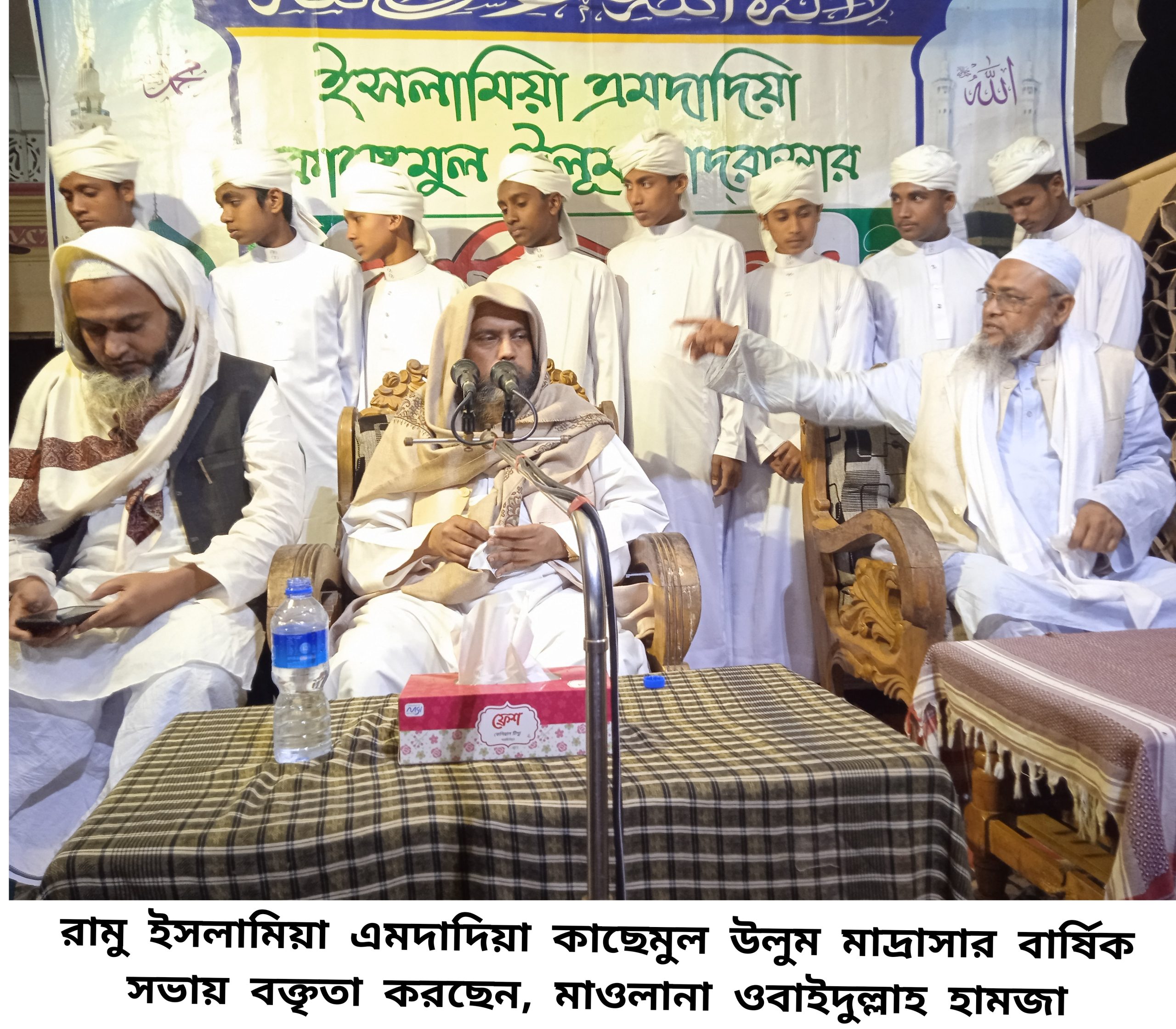 শুক্রবার, ১৭ ফেব্রুয়ারি রাতে রামু ইসলামিয়া এমদাদিয়া কাছেমুল উলুম মাদ্রাসার ৫৩তম বার্ষিক সভায় প্রধান বক্তার বয়ানে পটিয়া আল-জামিয়া আল-ইসলামিয়া মাদ্রাসার প্রধান পরিচালক মাওলানা ওবাইদুল্লাহ হামজা এ কথা বলেন।