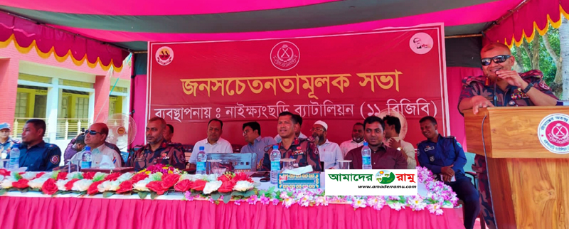 সীমান্ত অঞ্চল নাইক্ষ্যংছড়িতে জনসচেতনতামূলক সভা করেছে বর্ডার গার্ড বাংলাদেশ (বিজিবি)। সীমান্তে মাদক ও চোরাচালান প্রতিরোধ, অবৈধভাবে সীমান্ত অতিক্রম এবং সন্ত্রাস দমনে জনসচেতনতা বাড়াতে এ সভার আযোজন করা হয়। বুধবার (১৫ মার্চ) সকাল সাড়ে ১০টায় নাইক্ষ্যংছড়ি বিজিবি সরকারি প্রাথমিক বিদ্যালয় মাঠে অনুষ্ঠিত এ সভায়।