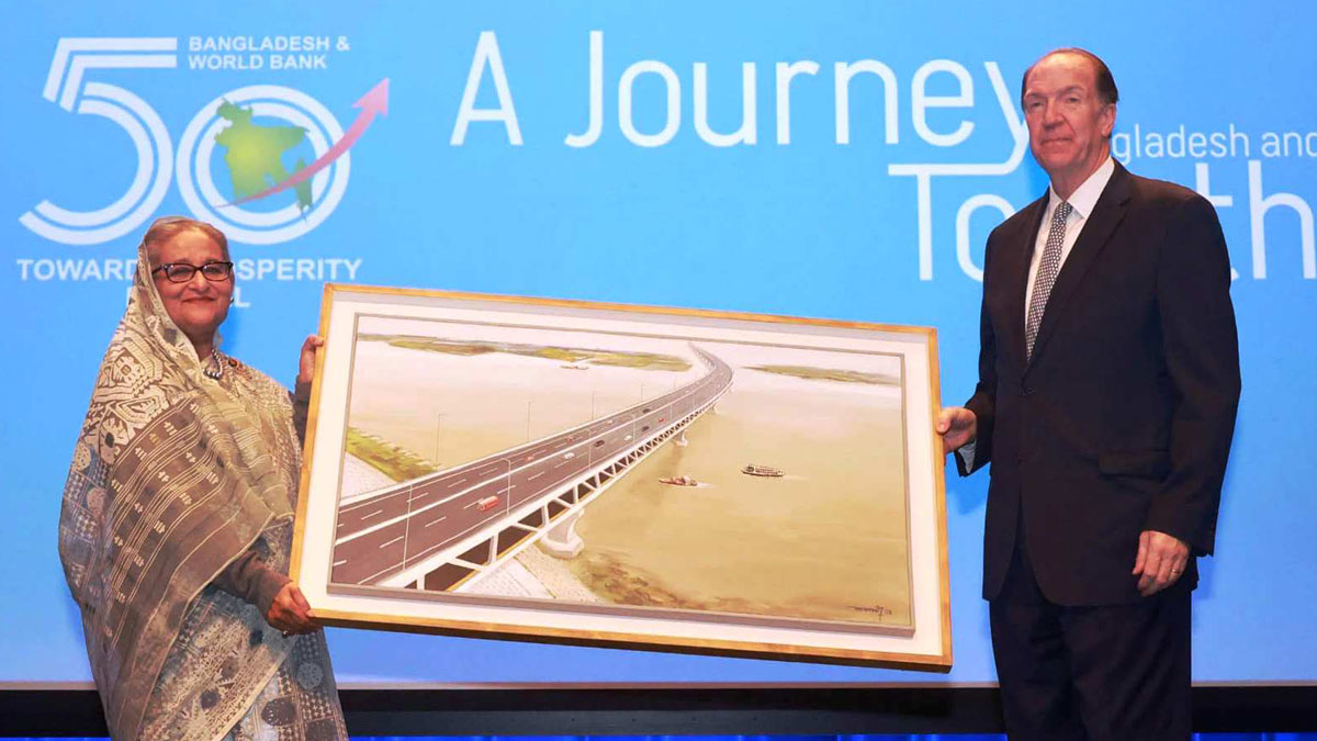 বিশ্বব্যাংক প্রেসিডেন্ট ডেভিড মালপাসকে পদ্মা সেতুর একটি বাঁধাই করা ছবি উপহার দিয়েছেন প্রধানমন্ত্রী শেখ হাসিনা। সোমবার (১ মে) ওয়াশিংটনে বিশ্বব্যাংক সদর দপ্তরে সংস্থাটির প্রেসিডেন্টের হাতে ছবিটি তুলে দেন প্রধানমন্ত্রী।