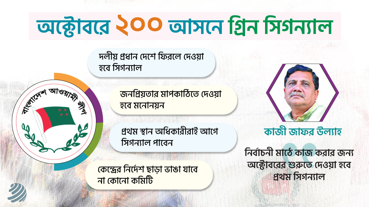 এ প্রসঙ্গে জানতে চাইলে আওয়ামী লীগের সভাপতিমণ্ডলীর সদস্য এবং দলের স্থানীয় সরকার ও সংসদীয় মনোনয়ন বোর্ডের সদস্য কাজী জাফর উল্যাহ ঢাকা পোস্টকে বলেন, ‘আগামী নির্বাচনে কারা মনোনয়ন পাবেন তা নিয়ে আমরা এখন কাজ করছি। এখনও চূড়ান্ত হয়নি। অক্টোবরের প্রথম সপ্তাহের মধ্যে ১০০ আসনের প্রার্থী তালিকা চূড়ান্ত করা হবে। তাদের গ্রিন সিগন্যাল দেওয়া হবে। নির্বাচন কমিশন যতক্ষণ পর্যন্ত তফসিল ঘোষণা না করবেন ততক্ষণ পর্যন্ত তাদের (মনোনীত প্রার্থী) অফিসিয়াল চিঠি দেওয়া হবে না। তবে, নির্বাচনী মাঠে কাজ করার জন্য একটি সিগন্যাল দেওয়া হবে।’