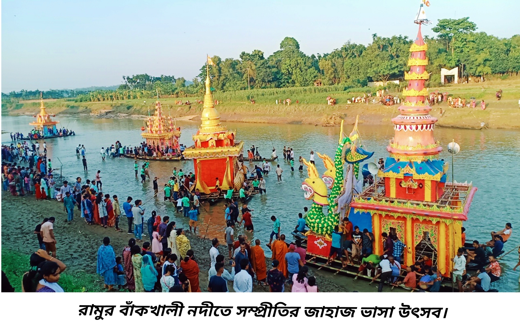 সম্প্রীতির জাহাজে ফানুসের আলোয়, দূর হোক সাম্প্রদায়িক অন্ধকার। এ শ্লোগানে রামুর বাঁকখালী নদীতে অনুষ্ঠিত হয়েছে, জাহাজ ভাসা উৎসব। বৌদ্ধ সম্প্রদায়ের অন্যতম ধর্মীয় উৎসব প্রবারণা পূর্ণিমা উপলক্ষে প্রতি বছরের ন্যায় এ বছরও রামুতে উদযাপিত হয়েছে জাহাজ ভাসা উৎসব। রঙিন কাগজের নান্দনিক কারুকাজে বাঁশ, বেত, কাঠ দিয়ে তৈরি করা হয় জাহাজ। পাঁচ-ছয়টি নৌকার ওপর বৌদ্ধ প্যাগোডা, জাদী বা চূড়া, ড্রাগন, ময়ূর, সিংহসহ বিভিন্ন প্রাণীর প্রতিকৃতির জাহাজ গুলো রোববার দুপুর থেকে সন্ধ্যা পর্যন্ত ভাসানো হয় বাঁকখালী নদীতে। বৈচিত্র্য নির্মাণ শৈলীর আটটি জাহাজে নাচে-গানে বুদ্ধ কীর্তনে বাঁকখালী নদীর এপার থেকে ওপারে ভেসে চলে। সম্প্রীতির মহাসম্মিলন জাহাজ ভাসা উৎসবে নদীর দুকূলে আনন্দে মাতোয়ারা হয় বৌদ্ধরা সহ সকল ধর্মের শত শত নরনারী।