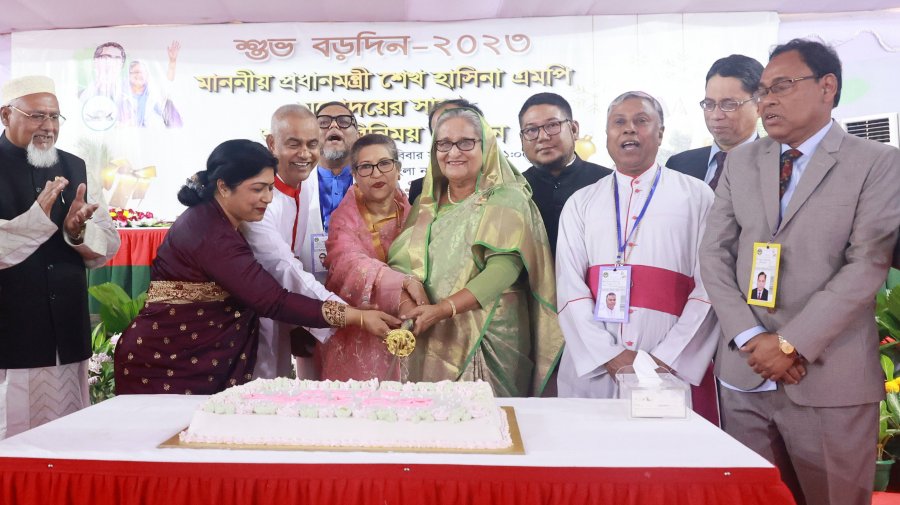গণভবনে আয়োজিত অনুষ্ঠান শেষে কেক কেটে বড়দিন উদযাপন উদ্বোধন করেন প্রধানমন্ত্রী শেখ হাসিনা ও তার বোন শেখ রেহানাসহ অন্যরা।