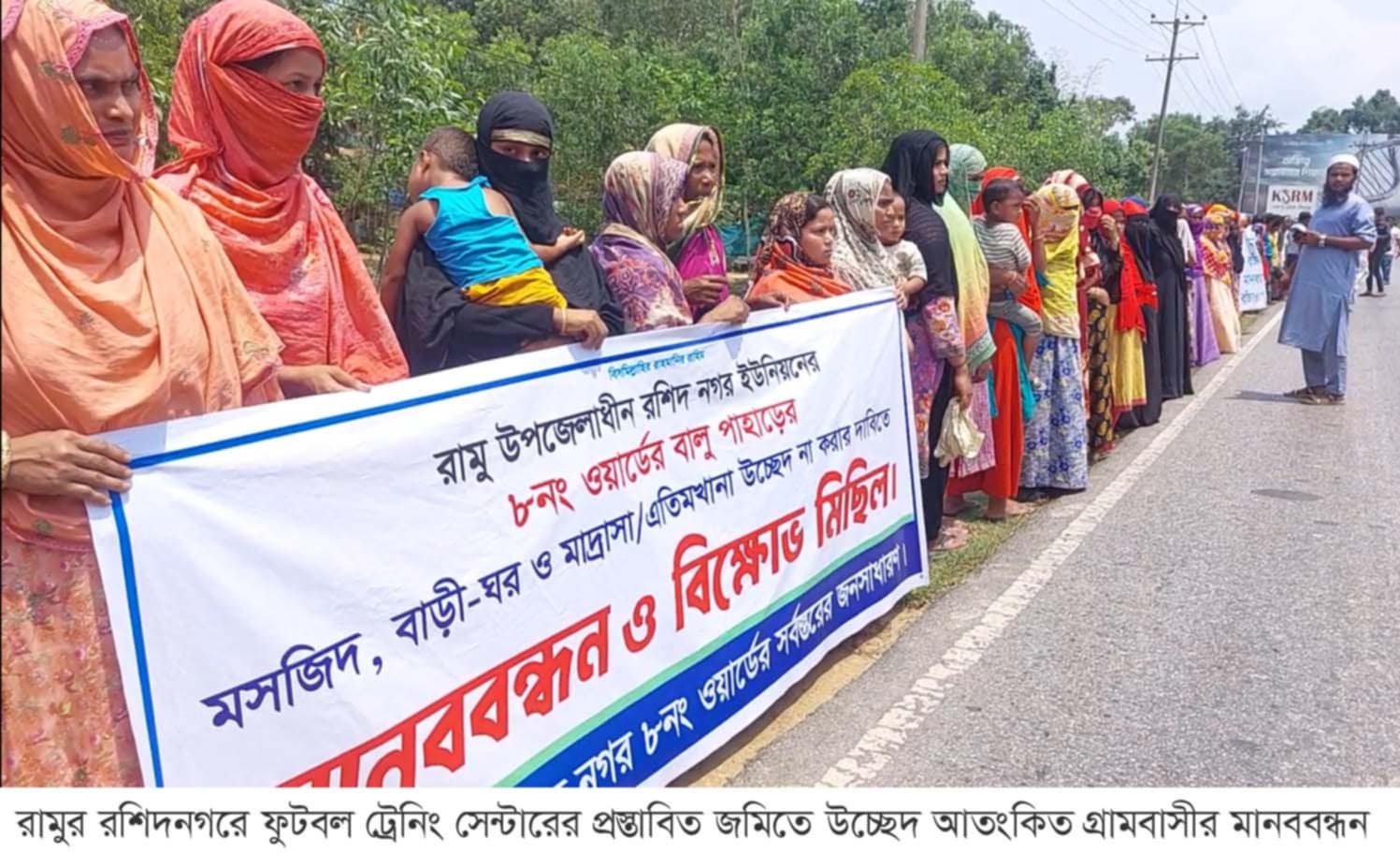 রামুতে বাফুফে টেকনিক্যাল সেন্টারের প্রস্তাবিত জমিতে উচ্ছেদ আতংকিত গ্রামবাসীর মানববন্ধন