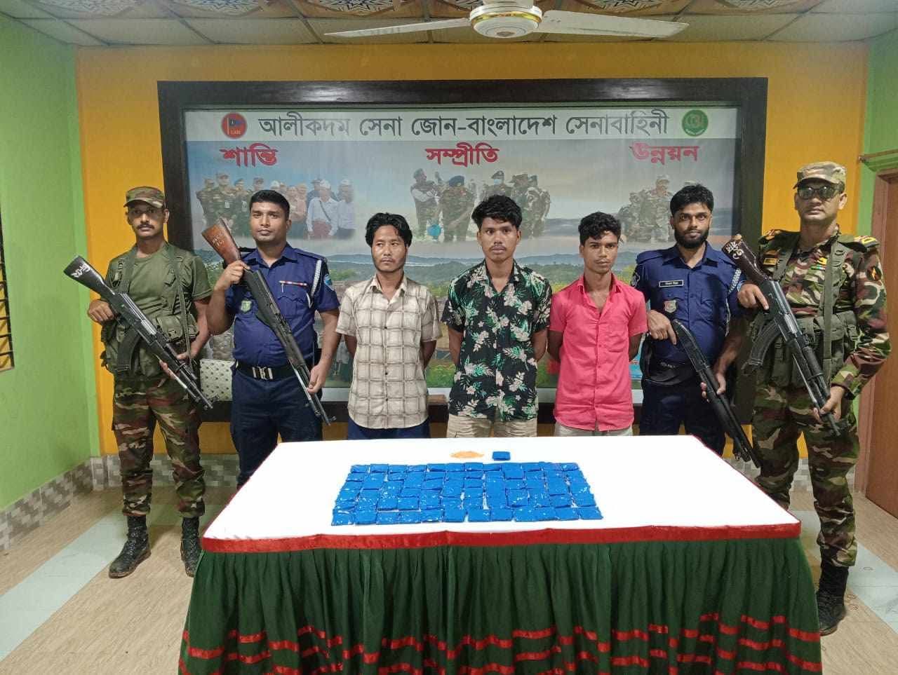 পার্বত্য জেলা বান্দরবানের আলীকদমে ৪নং কুরুকপাতা ইউনিয়নের ছোট বেতি এলাকার ত্রিপুরা পাড়ায় ১৪ হাজার ৫০০ পিস ইয়াবাসহ তিন জনকে আটক করেছে।